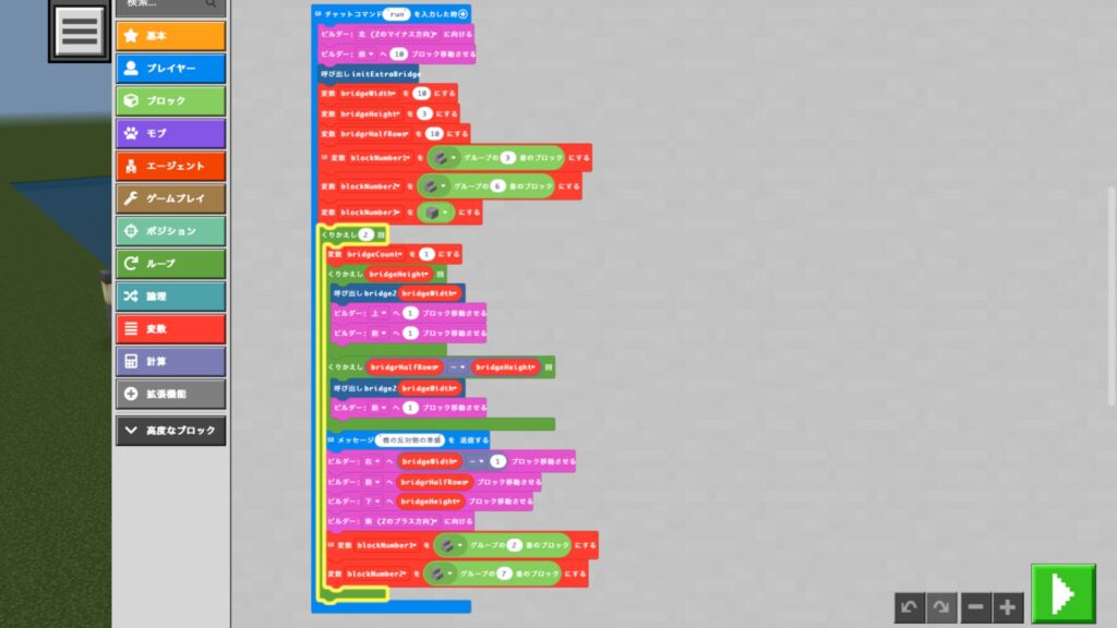 橋を半分作ったら、開始点を移動し、向きを反対に向け、ブロックの割り当てを変える。この準備ができたら、それまでの処理を単純に「くりかえす」。